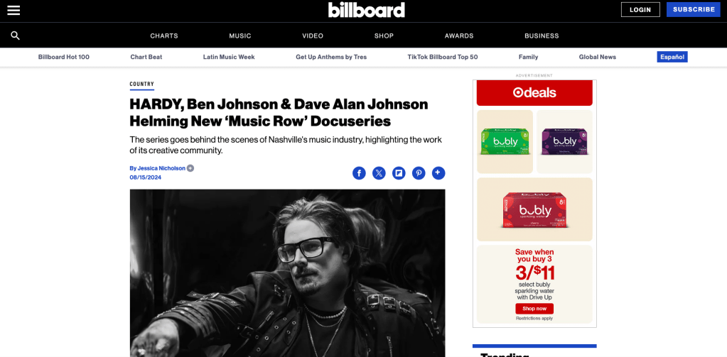 HARDY, Ben Johnson & Dave Alan Johnson Helming New ‘Music Row’ Docuseries Posted byAuthorOctober 4, 2024October 4, 2024Posted inUncategorized Click here to read the full article on Billboard. Related